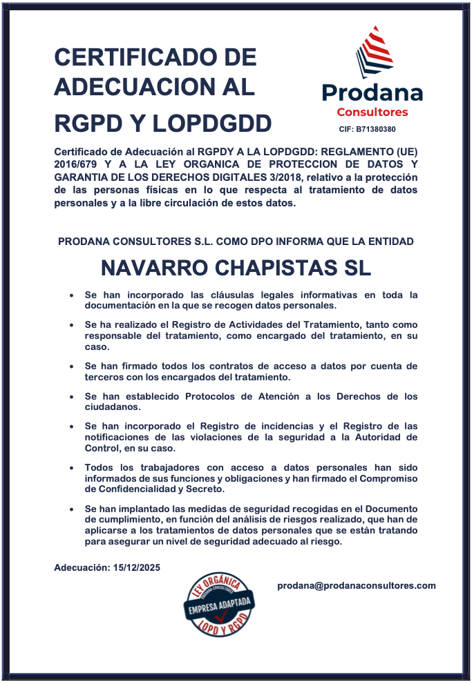 Por ello, y a efectos de lo previsto en el REGLAMENTO (UE) 2016/679 DEL PARLAMENTO EUROPEO Y DEL CONSEJO de 27 de abril de 2016 (en adelante, “RGPD”) y la ley LOPG GDD 3/2018 relativos a la protección de las personas físicas en lo que respecta al tratamiento de datos personales y a la libre circulación de estos datos, y lay la LEY 34/2002, de 11 de julio, de Servicios de la Sociedad de la información y de comercio electrónico (en adelante, “LSSI”),NAVARRO CHAPISTAS SL informa al usuario que, como responsable del tratamiento, incorporará los datos de carácter personal facilitados por los usuarios a los sistemas de tratamiento automatizados de la organización.